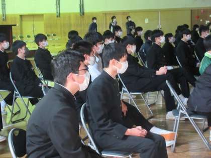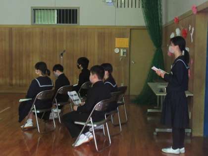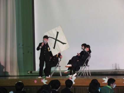 2/25 3送会1 公開日 2022/02/25 更新日 2022/02/25 校長より 午後、3年生を送る会を行いました。 3年生は体育館で、1・2年生は教室でリモート参加です。 進行とオープニングは生徒会です。 コミカルな劇で場を和ませてくれます。 てきぱきとした進行はさすがです。 いいね(0)