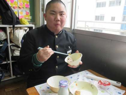 3年生の最後の給食は赤飯でした。 給食センターもやってくれますね!