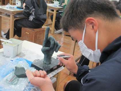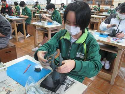 1年2組の美術です。 じっと見つめます。 集中して作ります。 もうすぐ完成です。
