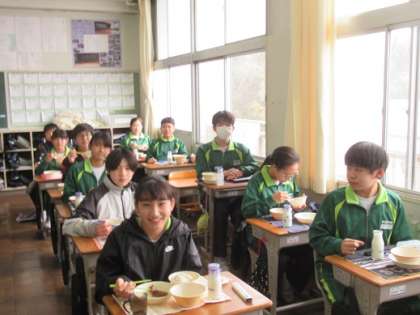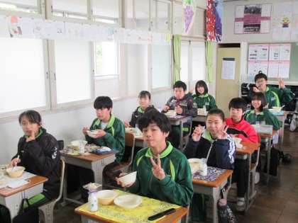 3/22 給食訪問 1の7 公開日 2022/03/22 更新日 2022/03/22 校長より 1年7組の給食訪問です。 明日で今年度の給食は最後です。 このメンバーで食べるのも最後です。 ちょっぴり寂しいけど、モリモリ食べよう! いいね(0)