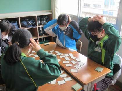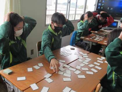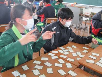 3/23 取ったり取られたり 公開日 2022/03/23 更新日 2022/03/23 校長より 1年2組の家庭科です。 伝統的な遊びで百人一首をしました。 目をつけていた札をうまく取ったり。 札が目の前にあるのに取られたり。 うわぁ〜。 歓声が聞こえます。 いいね(0)