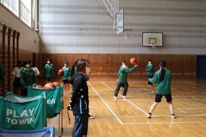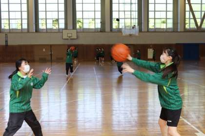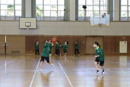 2022 05 02【授業の風景3】3-45体育女子 バスケットボール 公開日 2022/05/02 更新日 2022/05/02 校長より 3-45体育女子 バスケットボール 走りながらのパスとシュートはなかなか難しいね^^ いいね(0)