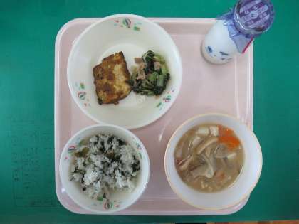 わかめごはん 牛乳 白みそ汁 さばのカレー焼き 野菜のごま和え