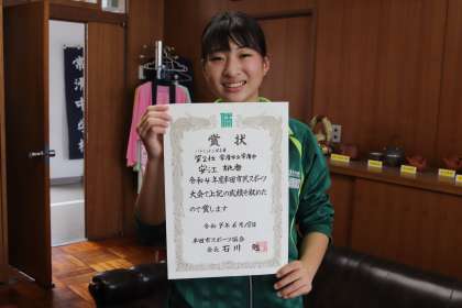 半田市民スポーツ大会(6月18日、半田市体育館)バドミントン女子シングルスで第2位に輝いた、2年2組の安江桃香さんが校長室に報告に来てくれました。