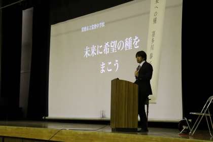 作家の喜多川泰氏を講師としてお招きし、「未来への種 講演会」を行いました。テーマは「未来への種をまこう」ということで、「なぜ勉強をするのか」「やる気を出すためにはどうすればよいのか」等の話をしていただき、自分の生き方について真剣に考える上でのヒントをたくさんもらうことができました。(3枚目の写真は、講演会後に質問・感想等を言ってくれた生徒と喜多川史氏との集合写真です)