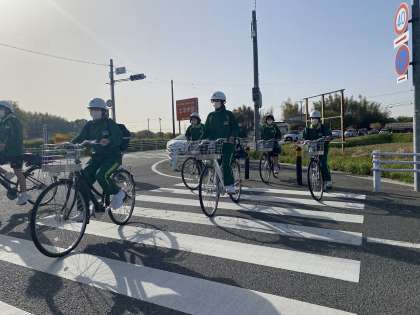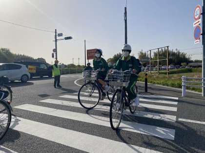 交通量も多く、朝の忙しい時間で車も急いでいることしばしば。そんな中、安全に自転車が通行できるように信号に合わせて子どもたちの通行を見てくれています。