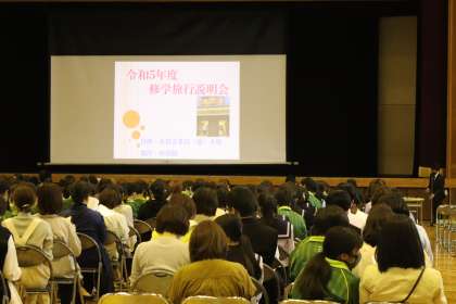 2023 04 28 【修学旅行説明会】 公開日 2023/04/28 更新日 2023/04/28 校長より 3年生は6月7日(水)から6月9日(金)まで東京・横浜方面へ修学旅行に出かけます。 新幹線、国会議事堂、TDL、東京分散研修、学級分散研修など充実した研修ができそうですね^^ いいね(0)