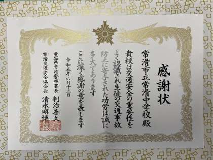 生徒の交通事故防止へ尽力している「交通安全功労団体」であるとお認めいただき、常滑中学校は感謝状をいただきました。