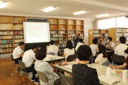 HAPPY TIMEをよりよい活動としていくために、さまざまな角度からご指導をいただきました。お話だけでなく、実際に曽山先生が先生役、常中の先生方が生徒として「質問じゃんけん」を行いました。実際にやってみて気づいたことが多くあり、とても有意義な時間となりました。