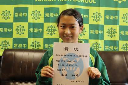 第41回名古屋地区中学新人陸上競技選手権大会(春日井市、令和5年9月16日)において、1年女子100mHで第6位(記録16.55)に入賞した、1年3組春口柚希さんが校長室に報告に来てくれました。おめでとうございます。