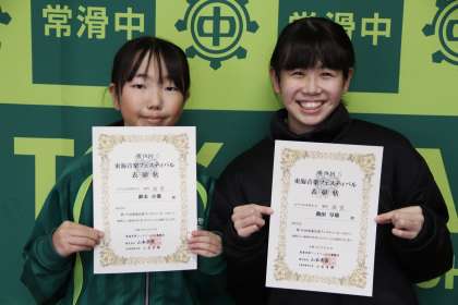 第19回東海音楽フェスティバル(東海音楽フェスティバル事務局主催、2023年11月12日)ピアノE中学生部門に出場し、受賞した、1年3組箱田早耶さん(銀賞受賞)、1年1組鈴木小葉さん(銅賞受賞)が校長室に報告に来てくれました。