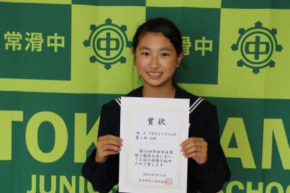 第34回半田市近郊陸上競技大会(半田市陸上競技協会、令和6年4月13日)中学女子100mHで第1位(記録15秒88)となった、2年7組春口柚希さんが校長室に報告に来てくれました。素晴らしい成績です☆おめでとうございます!