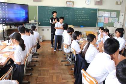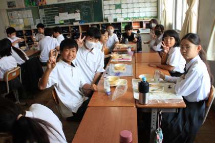 1年生の各教室へ給食時に校長が訪問し、一緒にグループ会食をする取り組みをスタートしました。題して「HAPPY LUNCH TIME」。1年6組に訪問しました。