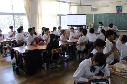 話題は合唱コンクール。本日は1年生のリハーサルの日でした。他クラスの歌声を聞き、刺激を受けています。この後の取組みがいいものになるといいですね。