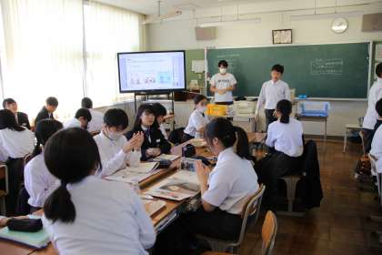 グループ会食全面実施に向け、1年生の各教室へ訪問し、校長がグループに同席して会食する取組み「HAPPY LUNCH TIME」を行いました。本日は1年1組に訪問し1年生の全てのクラスで2回の会食を楽しみました。ありがとう☆