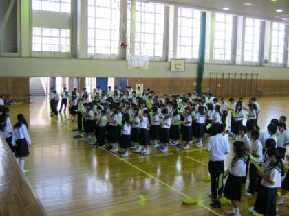運動会にむけて,赤・青・黄・緑それぞれのチームが控え席での応援の練習を,3年生中心に色別会が行われました。