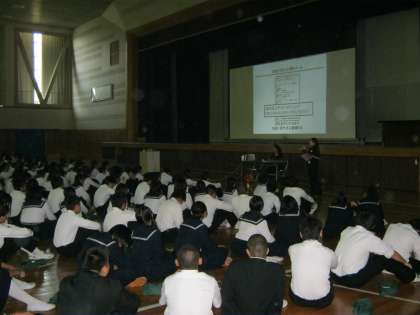 携帯電話の便利な機能で地震などの緊急連絡メールの紹介から始まり,チェーンメールやなりすましメール,プロフや肖像権など具体的な例を映像で紹介がありました。