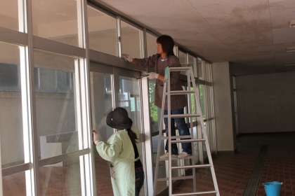 (写真右)いつも図書館ボランティアをしてくださっている方々が,本日はガラス清掃ボランティアをしてくださいました。本当にありがとうございます。(詞)