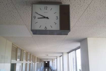 上の写真は、下校後の廊下の様子ですが…時計が変です。