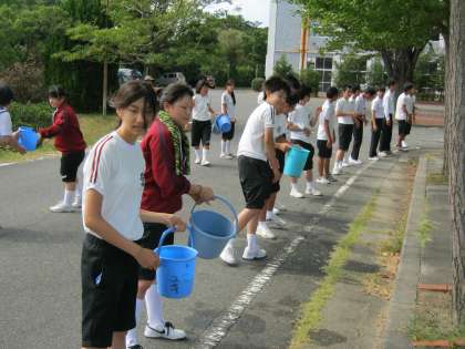 今日は小中学校の市内一斉地震・津波からの避難訓練を行いました。強い地震が起きたことを想定し、運動場へ避難する訓練を行いました。その後、1年生は消防署体験、2年生は避難所設営体験、3年生は水運び・仮設トイレ作成体験をしました。常滑中学校は避難所となっていますので、もしもの時は中学生が貴重な戦力となれるようにこれからも訓練をしていきます。(お)