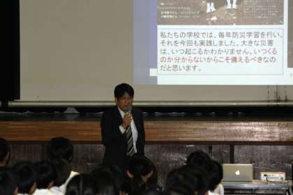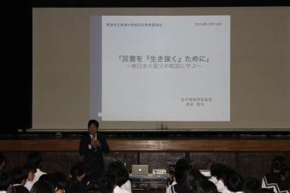 第2回の学校保健委員会を行いました。講師に岩手県教育委員会の森本晋也先生をお招きし、「災害を『生き抜く』ために」と題して、講演を行っていただきました。震災以前から取り組んでこられた防災学習について、経験をもとにお話をしていただきました。常滑中学校は地域の避難所となるので、中学生として地域のために何ができるか考えておく必要があることを改めて実感しています。(お)