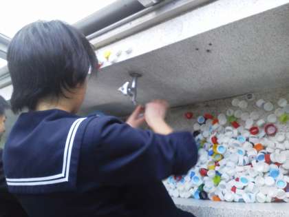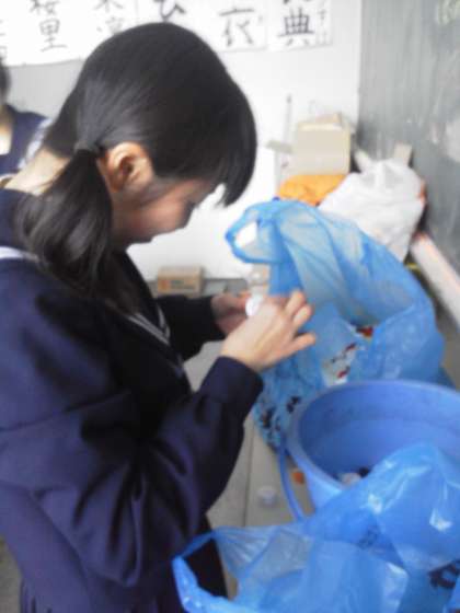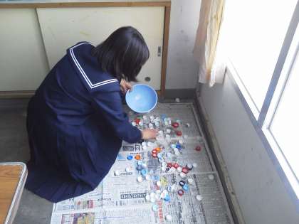 常滑中学校では,ペットボトルキャップを集めて,発展途上国の子どもたちのワクチンに変えようという運動を行っています。上の写真は,その出荷作業を行っているところです。シールを取って,洗って,乾燥させて袋詰めをします。家にペットボトルキャップがあれば,どんどん常滑中学校まで持ってきてください。(寺)