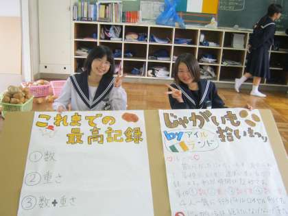 午後の授業時間から,全校中が文化祭準備に取りかかりました。みんながテキパキと動いてくれたおかげで,どのクラスもクラス発表の準備が完成していました。普段は机やイスが並んでいる教室は,今では華やかなお祭りムードです!