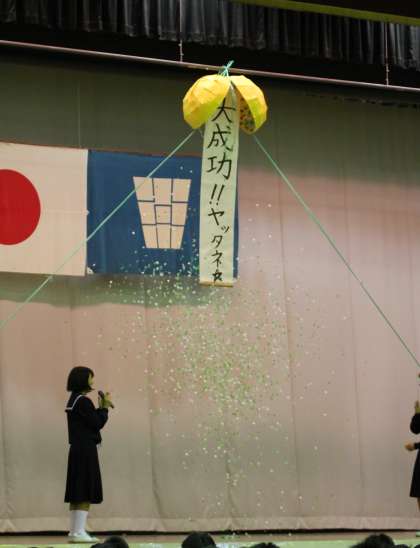 最後に,後期生徒会執行部によるセレモニーが行われました。常中ニュースと題して,ニュース番組風に生徒にインタビューをしました。どの生徒もこの2日間をとても楽しんでいたようです。最後に,常中文化祭の成功を祝してくす玉を割りました。昨年度より始まった常中文化祭は今回で2回目。文化祭の歴史は,昨年の「A New Page」に続いて,今回の文化祭で「見開き1ページ」となりました。これからもさらに発展していくことを期待します。(一)