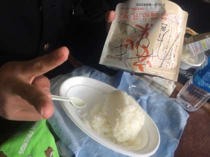 今日の給食は,災害用に備蓄されている非常食でした。アルファ化米に水を入れて,待つこと1時間,おいしいごはんが出来上がりました。珍しい食べものに,生徒は興味津々でした。(一)