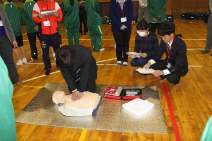 陸上部の生徒と先生方は,AED講習会をしました。胸骨圧迫やAEDの使い方などを消防署の救急救命士3名に教えてもらい,訓練をしました。(一)
