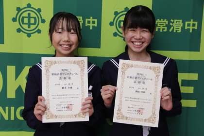 第20回東海音楽フェスティバル(東海音楽フェスティバル事務局、株式会社山本楽器、令和6年11月10日、瀧上工業雁宿ホール)でピアノE部門に出場し、銀賞を受賞した、2年7組鈴木小葉さん、2年3組箱田早耶さんが校長室に報告に来てくれました。☆おめでとうございます!