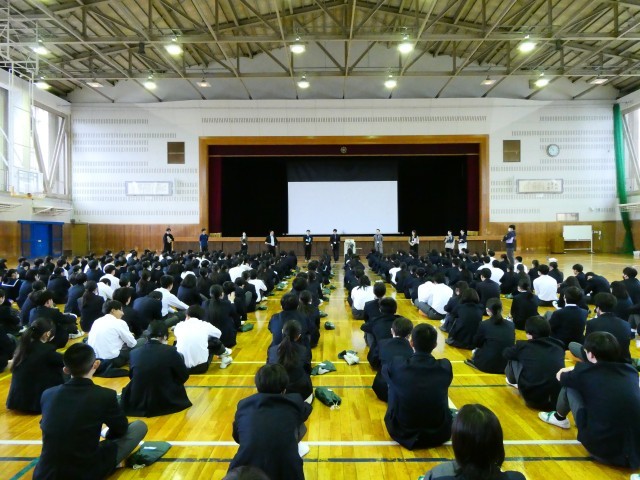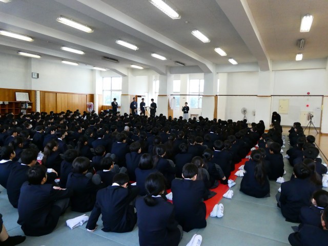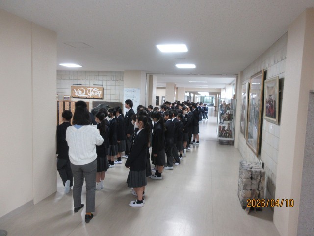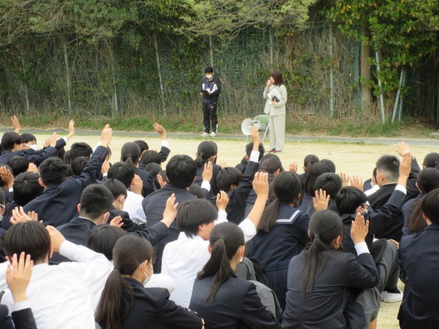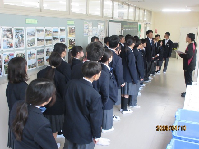 生徒指導主事からは、春休みの過ごし方について、①自転車の安全で正しい乗り方、②SNSの正しい利用、③公共施設や商業施設のマナーを守った利用についてお話がありました。また、新年度に向けて、「自分にできることを考えて、新たな一年をスタートできるようにしよう」とお話がありました。