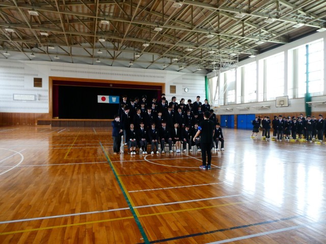 生徒指導主事からは、春休みの過ごし方について、①自転車の安全で正しい乗り方、②SNSの正しい利用、③公共施設や商業施設のマナーを守った利用についてお話がありました。また、新年度に向けて、「自分にできることを考えて、新たな一年をスタートできるようにしよう」とお話がありました。