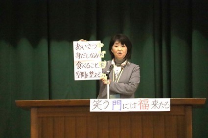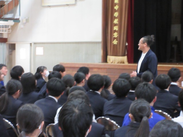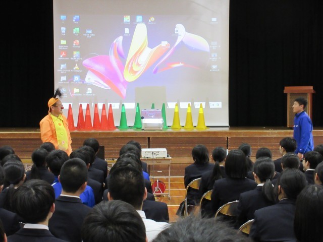 講師として、大棟耕介様をお迎えし、「個性を大切にした生き方」についての講話をいただきました。講話の前には、楽しいパフォーマンを披露していただき、全校生徒が笑顔になりました。講話では、人は一人では生きられないからこそ友達が大切であること、期待されることはプレッシャーもあるけど、目標をより高くもてるチャンスであり、その実現に向けて挑戦することが大切であることなどについてお話をいただきました。