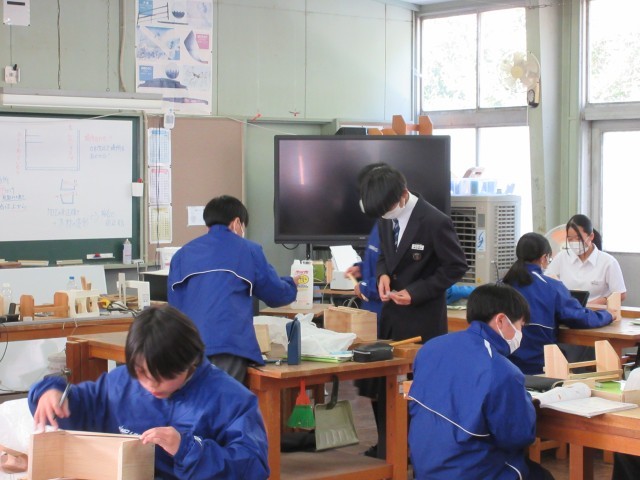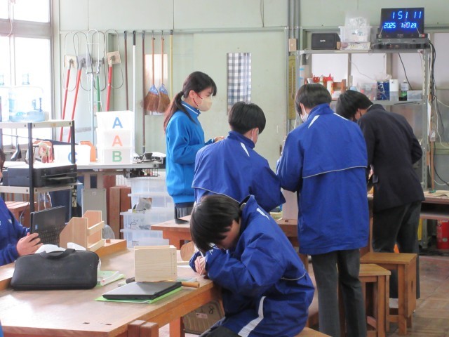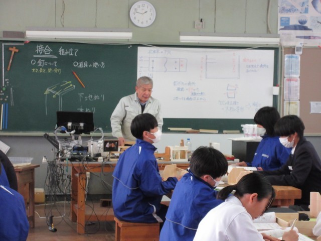 5時間目、木材加工の勉強をしていました。接合の仕方に気をつけながら組み立てをしていました。本立て、入れ物など、完成後の用途は人それぞれです。できあがりが楽しみです。
