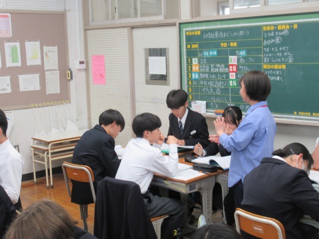 6限に、校内地震避難訓練を実施しました。教室で「緊急地震速報」が鳴り、地震が発生したところから、2次避難として運動場に避難し、点呼して全員の無事を確認するまでの訓練です。避難経路の確認、そして、小学校からずっと教えられてきた「お(押さない)は(走らない)し(しゃべらない)も(もどらない)」の確認などし、真剣に取り組むことができました。担当の先生から、緊急時に動揺する中で命を守るには、何度も繰り返し訓練をして身につけておくことが大切という指導がありました。
