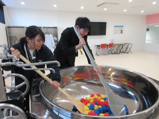 大きな釜を混ぜる体験では、調理員さんの大変さを実感しました。