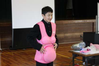 DVDで新しい生命が誕生するまでを見て、人形を使って赤ちゃんが生まれるまでの様子を分かりやすく教えていただきました。また、妊婦体験も貴重な体験でした。