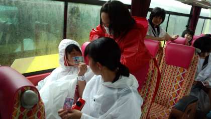 ディズニーシー到着。大雨です。しかし、生徒の皆さんは雨具を来て遊ぶ気満々です。やる気が違います。