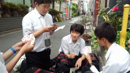 昼食場所に着きましたが、まだ開店前のため、時間つぶしにトランプゲームをしています。