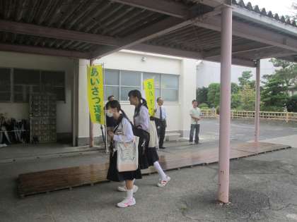 生徒の皆さんは、普段とは違う様子に驚きながらも、しっかり挨拶しました。