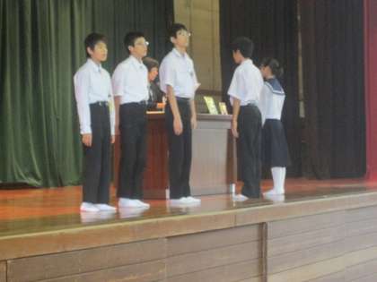 本日の朝会は、後期生徒会執行部と学級三役の任命がありました。