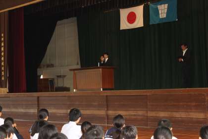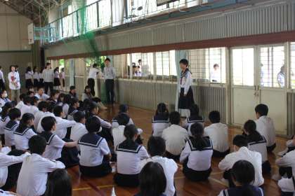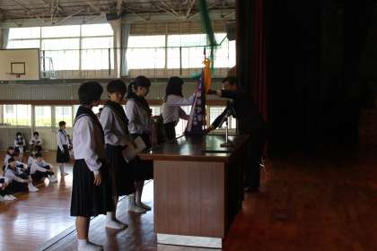 朝会では,市民バスケットボール大会で優勝した女子バスケットボール部が表彰を受けました。誇らしい表情が印象的でした。
