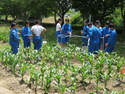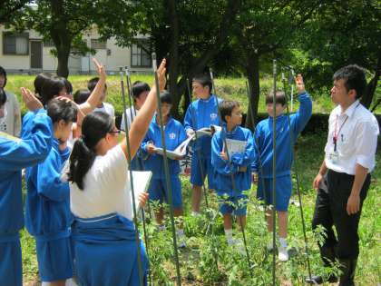 1年生の技術の授業では,「栽培」の単元で,野菜づくりに取り組んでいます。校地内の農園にトウモロコシを植えて観察したり,栽培方法を工夫したりしています。トマトの栽培についても,教師の説明を受けて,理解を深めていました。