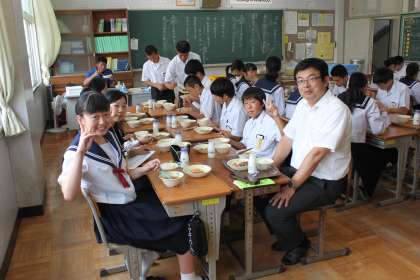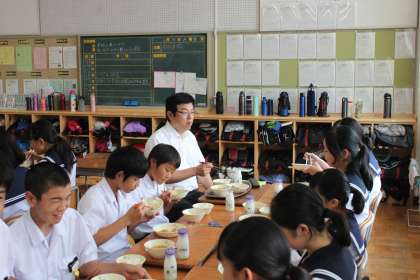 6/20(火)校長給食訪問 公開日 2017/06/20 更新日 2017/06/20 学校の様子 林間学校を来週に控えた2年生。各実行委員を中心として進めてられてきた準備も,いよいよ大詰めです。 今日は校長が給食訪問をして,2年生とともに会食しました。おいしい給食をほおばりながら会話に花を咲かせ,楽しいひとときとなりました。 いいね(0)