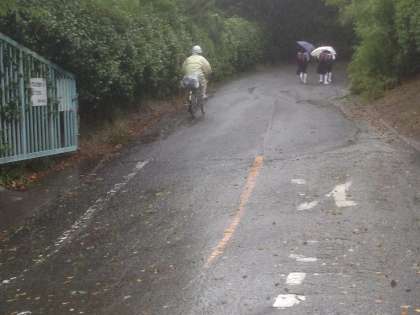 今後も登校時、悪天候で安全面で心配な場合は、安全な道で迂回しながら慌てず登校したり、場合によっては保護者の方のご了解のもと登校を見合わせて様子を見たりすることも必要だと考えます。お車で保護者の方が送迎くださる場合は、武道場側か、正門北側のゴミステーションの前のスペースをご利用ください。