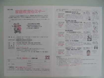 本日、家庭教育セミナーの案内を配付しました。PTAの委員の皆様にも、セミナーの企画に携わっていただき、大変有意義なセミナーが企画されております。コーチング、片付け術、太巻き作りなど、楽しい講座が一杯です。ぜひこの機会をご利用ください。