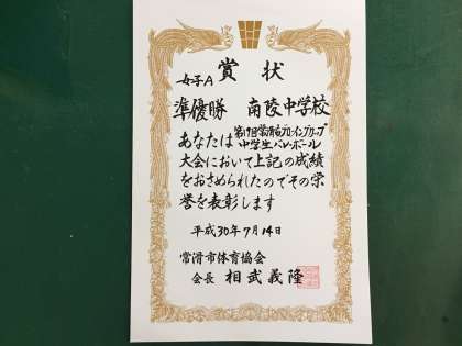 南陵中Aチームが、常滑グローイングカップバレーボール大会で準優勝しました。これまでの努力の賜物です。次はいよいよ郡大会です。チーム一丸となって全力でアタックしましょう。