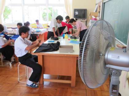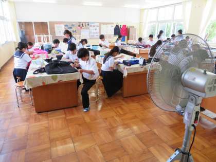 うだるような暑さにも負けずに、南陵中生は学校生活をがんばっています。写真は1年生家庭科の授業と2年生数学の授業の様子です。教室は32〜34度になる時間もあります。扇風機を各教室2台ほど回して、暑さ対策をしていますが、子どもたちは本当によくがんばっています。