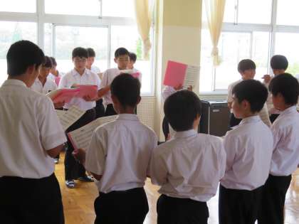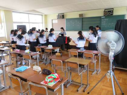 2年生の音楽の授業では、2学期に行う合唱コンクールの自由曲のパート練習などを行いました。暑い音楽室には扇風機もフル稼働です。